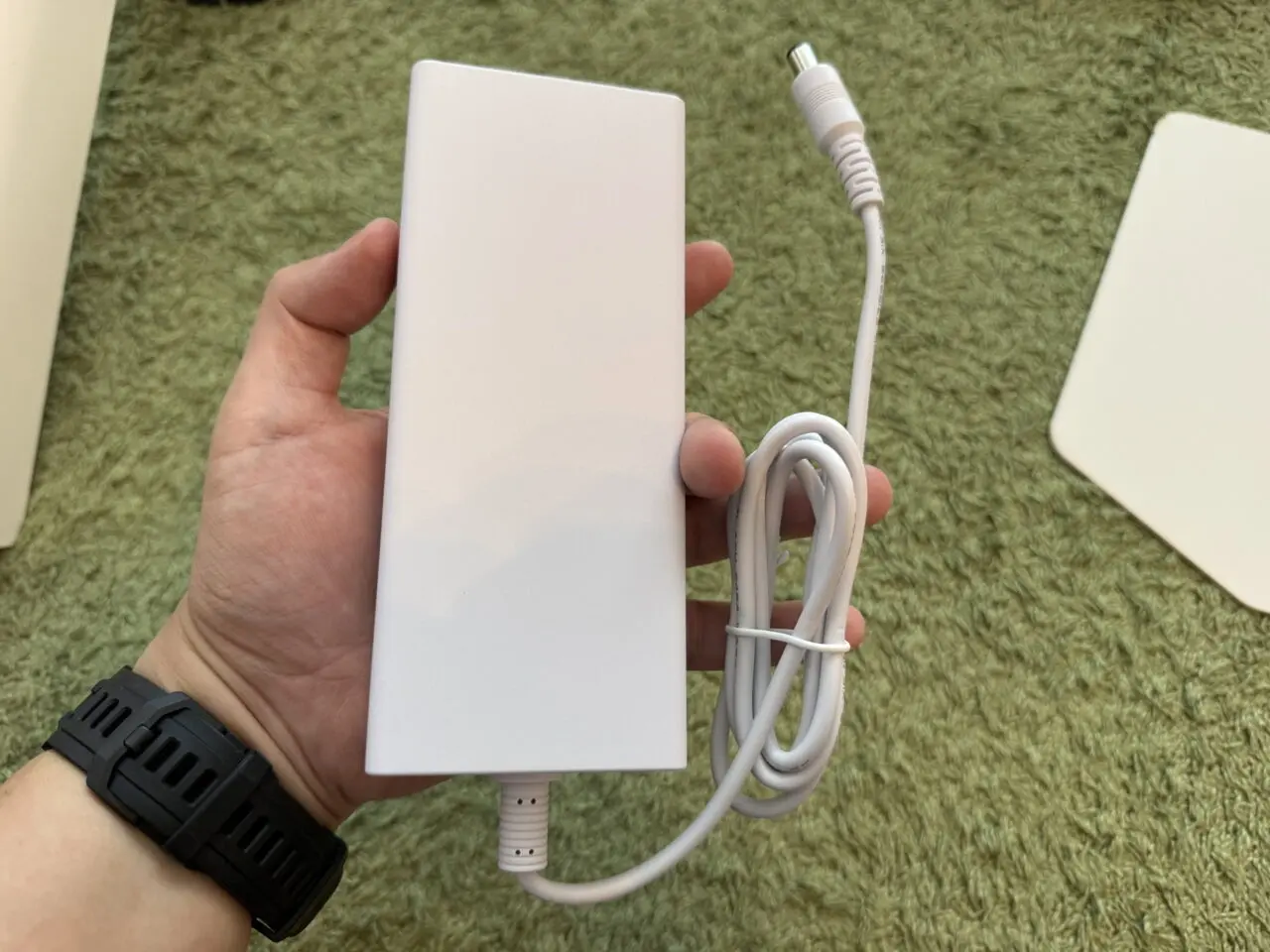 INNOCN GA27V1Mの電源アダプタを手に持っている様子