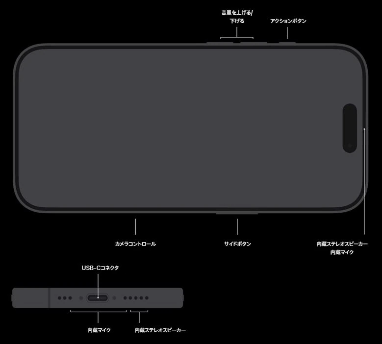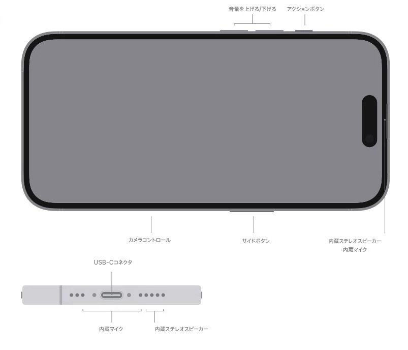 左側面に搭載されているアクションボタンでは、消音モード、集中モード、カメラ、フラッシュライト、ボイスメモ、ミュージックを認識、翻訳、拡大鏡、コントロール、ショートカット、アクセシビリティなどの機能を使用できます。