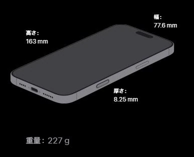 iPhone 16 Pro Maxのサイズは高さ163mm×幅77.6mm×厚さ8.25mm、重さは約227gであり、16シリーズの中では最も大きいです。