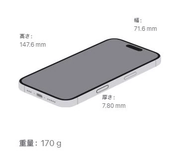 筐体サイズは高さ147.6mm×幅71.6mm×厚さ7.80mm、重量は約170g。サイズ的には前モデルのiPhone15と全く同じです。