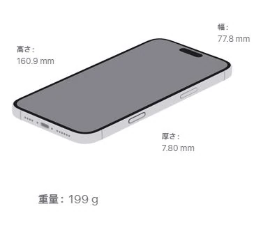 筐体サイズは高さ149.9mm×幅71.5mm×厚さ8.25mm、重量は約199g。サイズ的には前モデルのiPhone15 Proよりも高さが+3.3mm、幅が+0.9mm大きくなっています。厚みは変わりません。