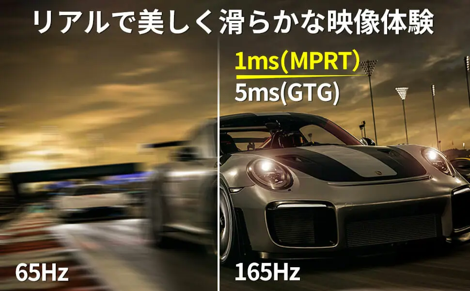 165Hzの高リフレッシュレートに対応しており、一般的なモニターと比べて遥かに滑らかな描写が可能になるため、動きの速いシーンやゲーミング時において映像が遅れたり残像が生じるのを抑えることが出来る。