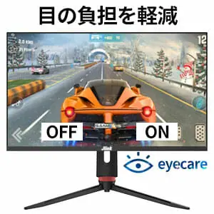 そしてただ映像が美しいだけでなく、目の疲れを低減するための「ブルーレイカット機能」「フリッカーレス機能」を搭載。長時間のゲーミングや作業を行った場合でも目への過負担を避けることが出来る。