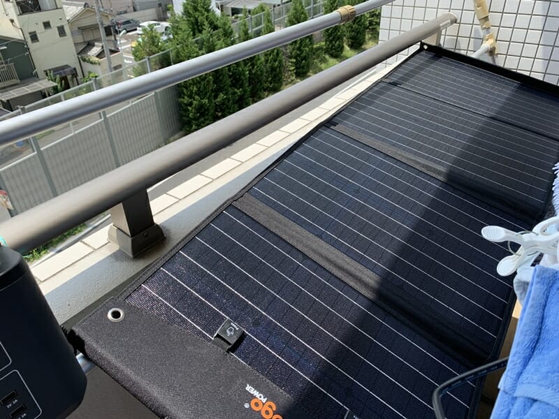 ▼実際に自宅ベランダにソーラーパネルを設置して、充電を行ってみた。