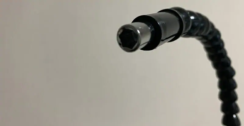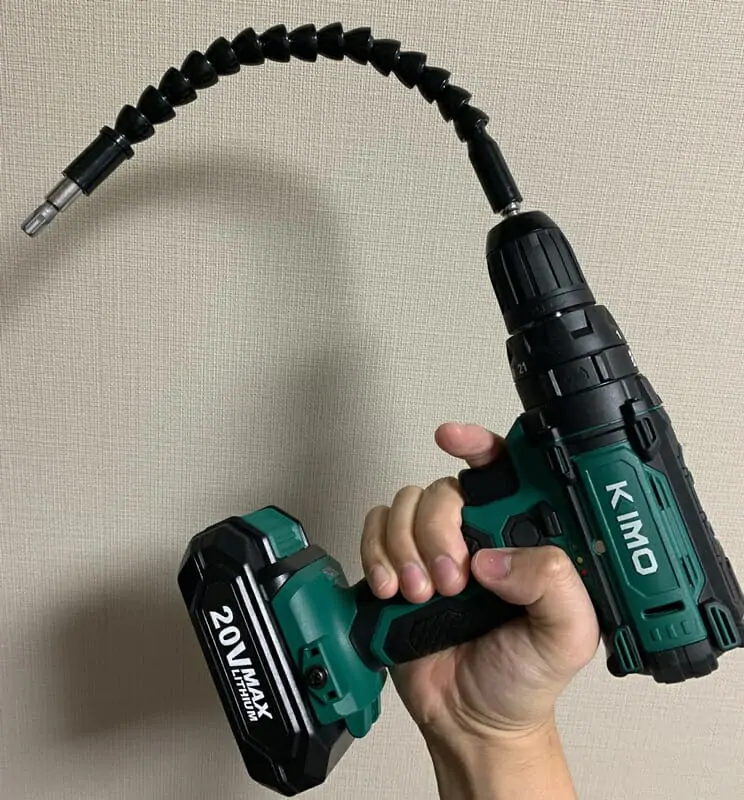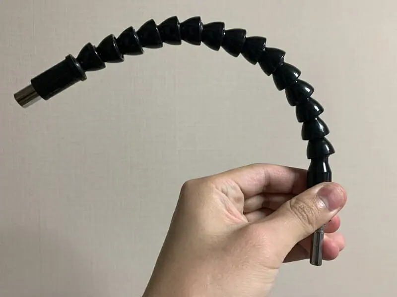 蛇腹状になったこの管は、先端にビットを取り付けた状態でドリルドライバーに装着することで、ドリルドライバーが入らない狭い箇所に対しても、作業を行うことが出来る。