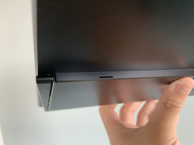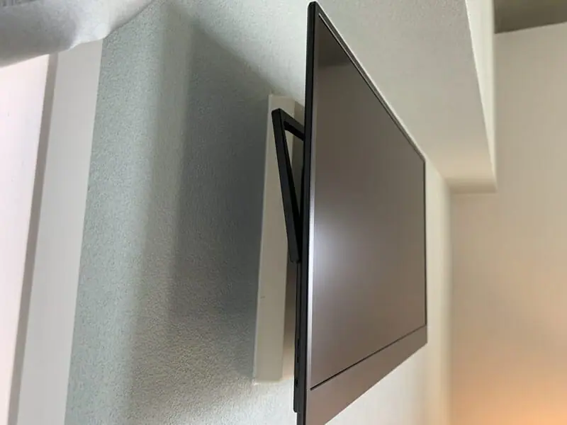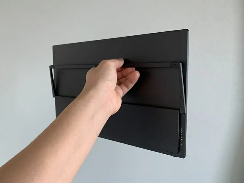 ▼スタンドを手で掴んで移動させたり、壁の出っ張りに掛けて、簡易的な壁掛けモニターを実現することも可能。