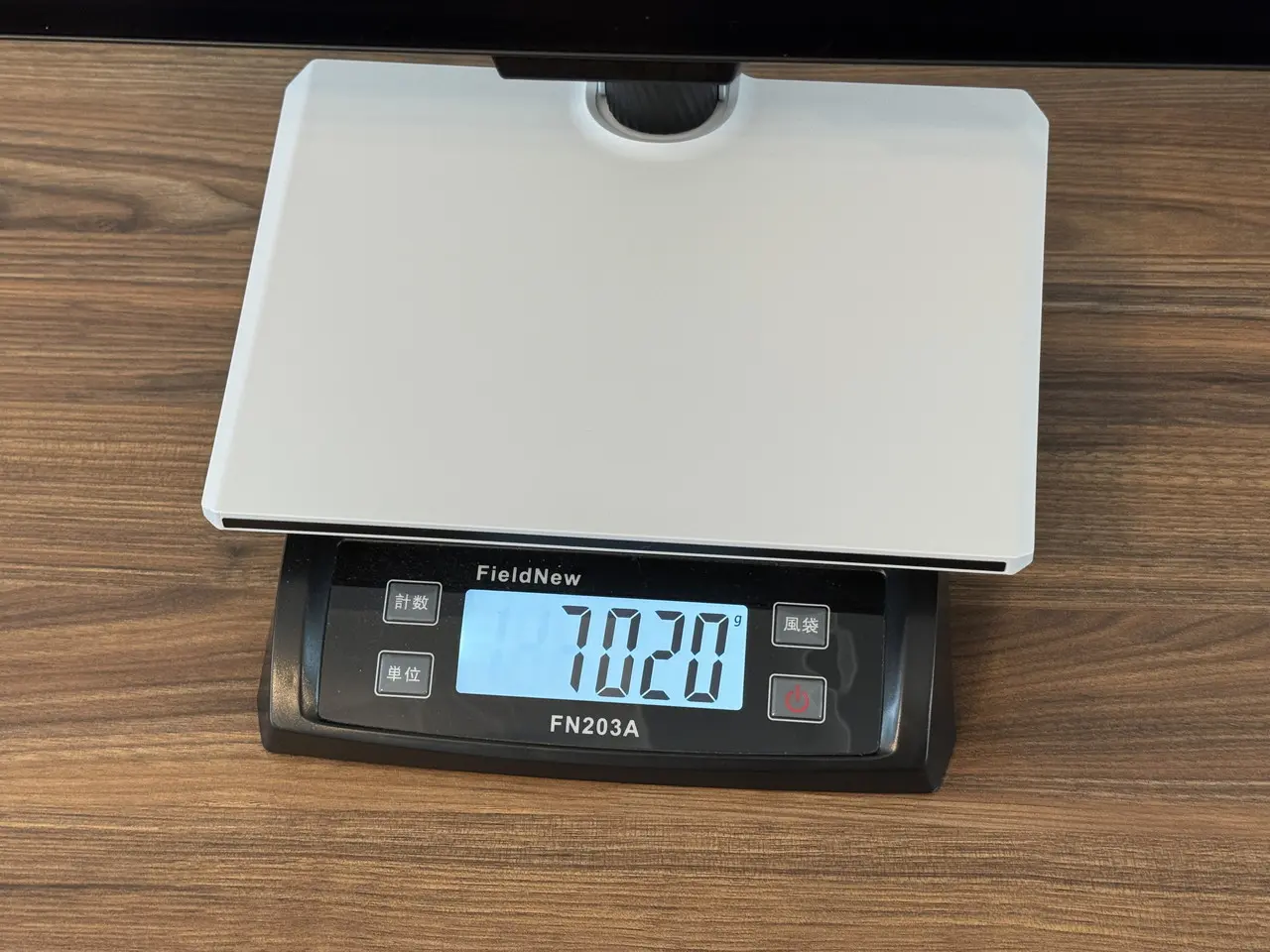 スタンド&ベースを装着した状態の重量は、実測で約7,020g。手で持つとややズッシリ感があるものの、設置場所の移動に支障をきたすレベルではない。