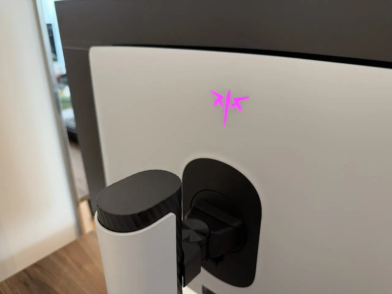 ▼背面中央にはスタンド取り付け用ポートが用意。75mm×75mmサイズの四つ穴も開いており、モニターアーム等を接続することも可能。また、背面上部には、モニター起動時に点灯する、KTCロゴを型取ったLEDライトが内蔵。