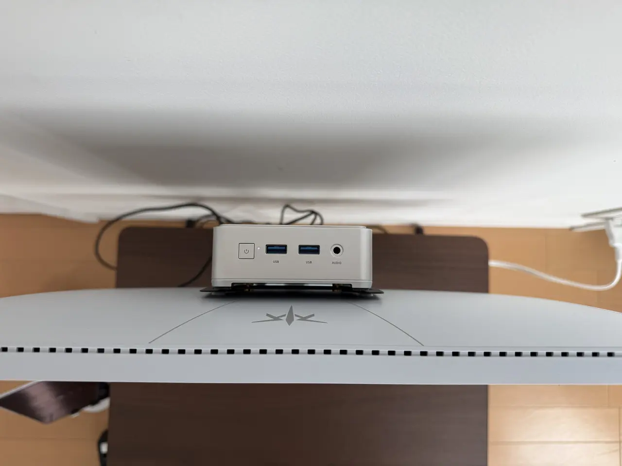 VESA規格対応のブラケットを使って、ミニPCをモニター背面に固定設置することで、非常にコンパクトかつスタイリッシュな作業空間を実現できる。