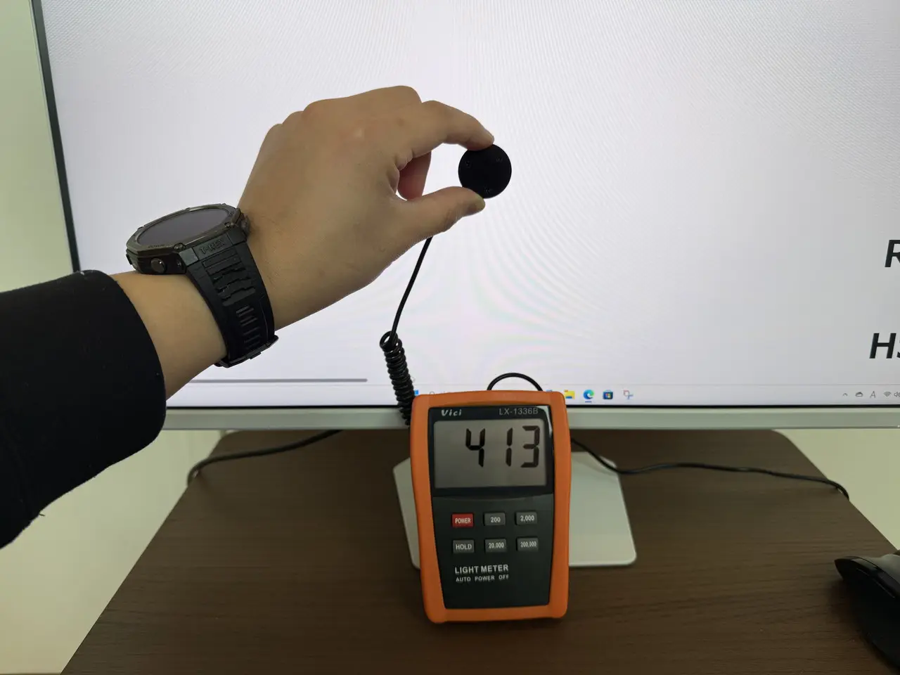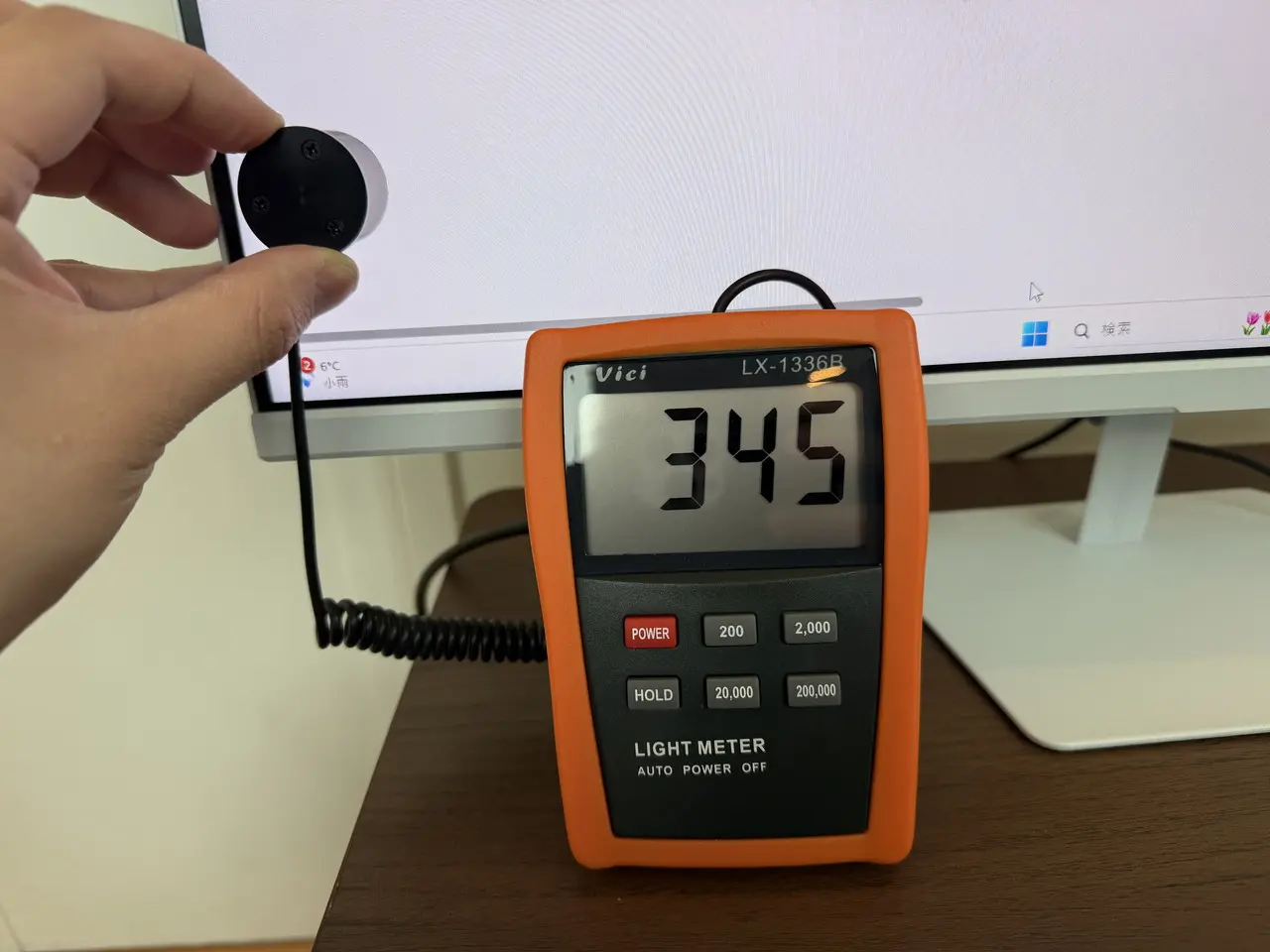 また、デジタルルクスメーター「Vici LX1336B」を使用して、明るさ設定を100にした際の画面輝度についても確認してみた。