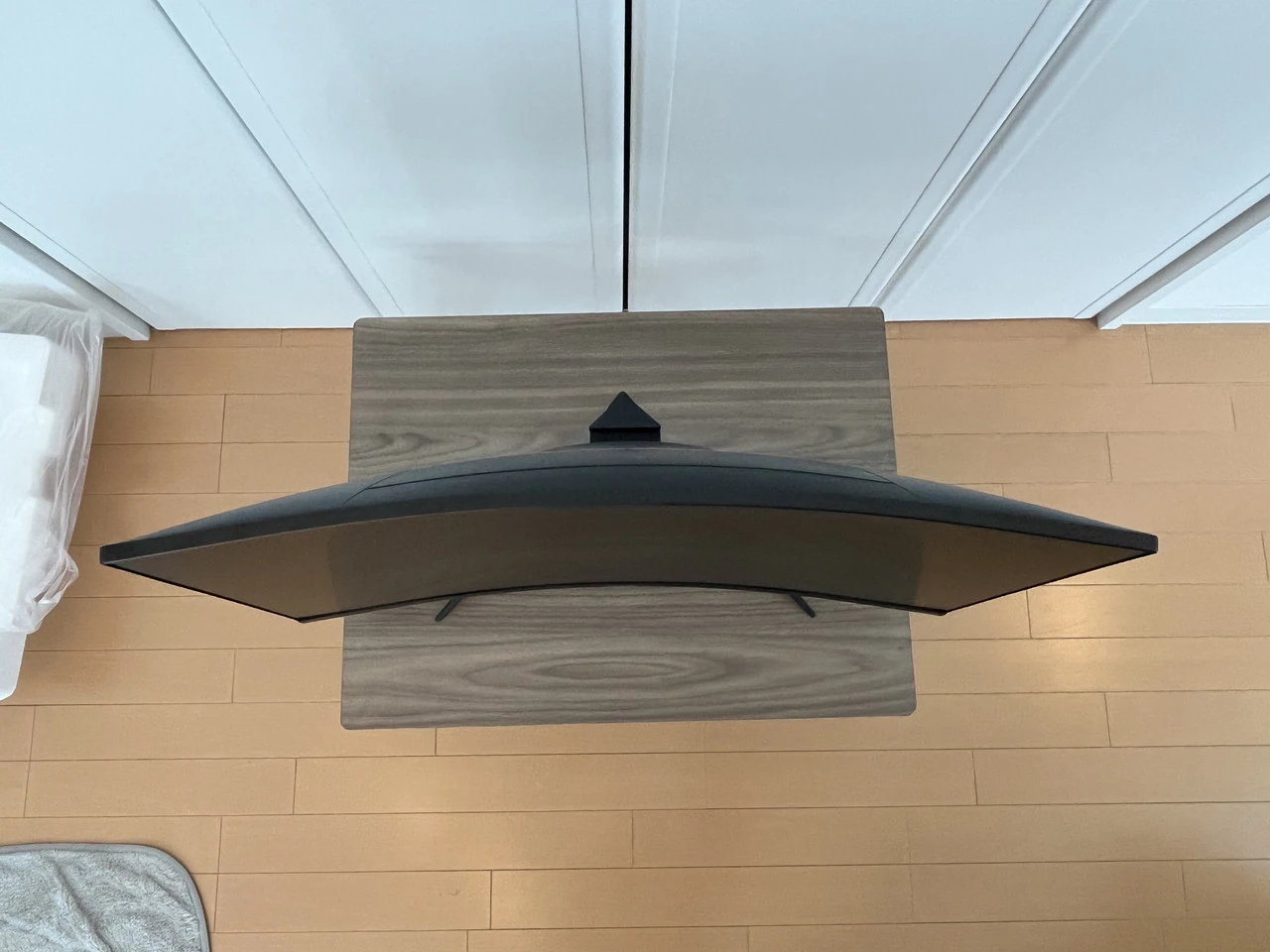 曲率1500Rの湾曲ディスプレイにより、視界全体を包み込むような没入感が得られる。また、目の距離が画面の端から端まで均等になるため、フラットディスプレイよりも目の移動が少なく、視覚疲労を軽減する効果もある。