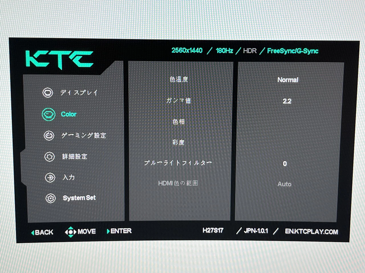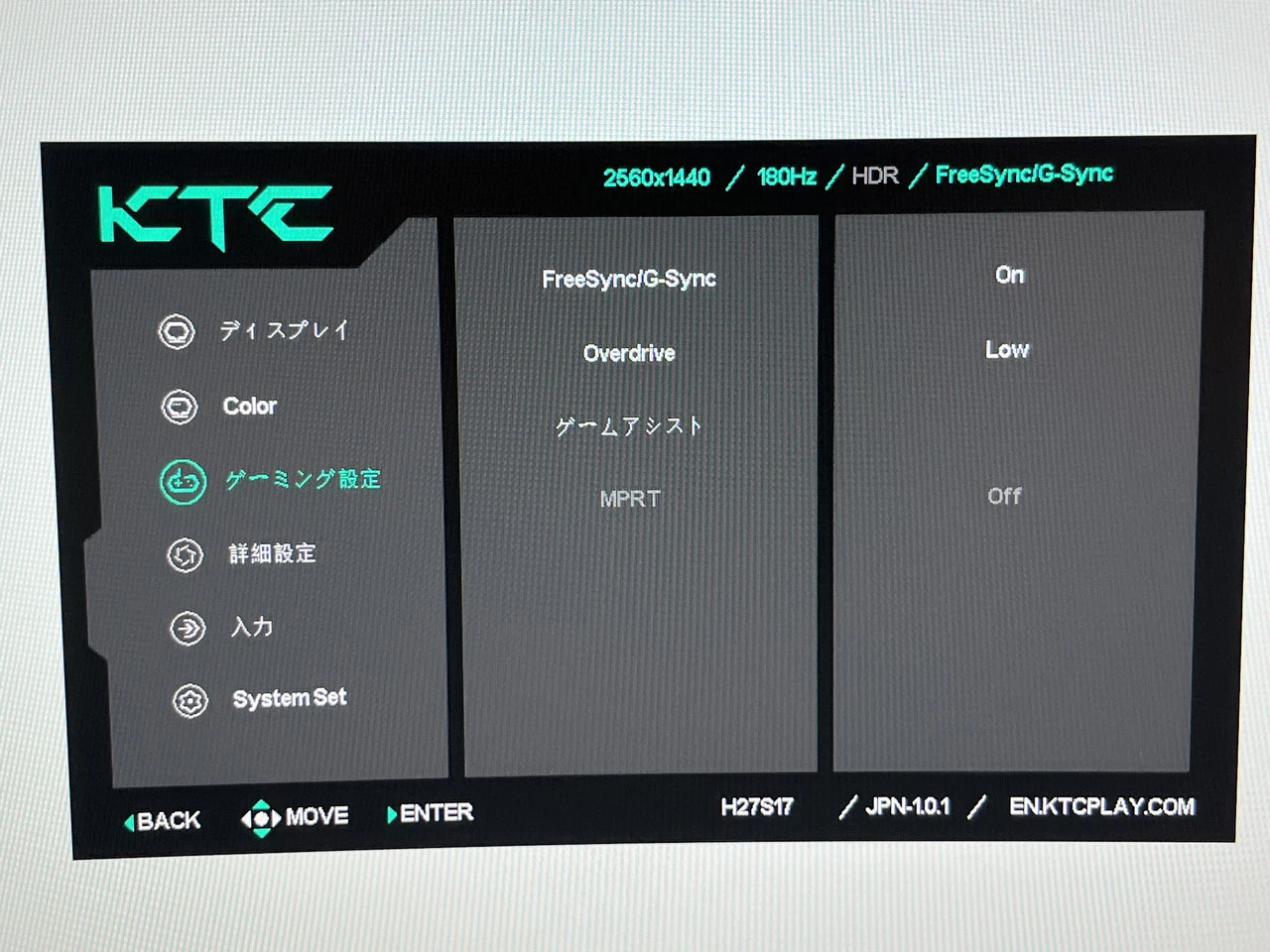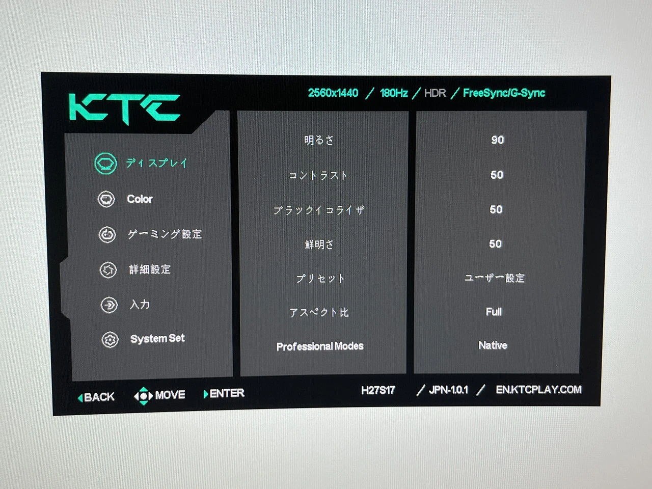 PS5接続時には4K(3840x2160)解像度出力と表示されるが、実際にはKTC H27S17のネイティブ解像度2560x1440にダウンスケーリングされて描画される。