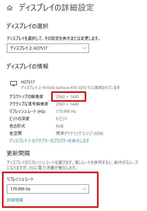 ▼PCの映像出力情報。2560×1440(WQHD)のネイティブ解像度、および最高180Hz出力に対応。