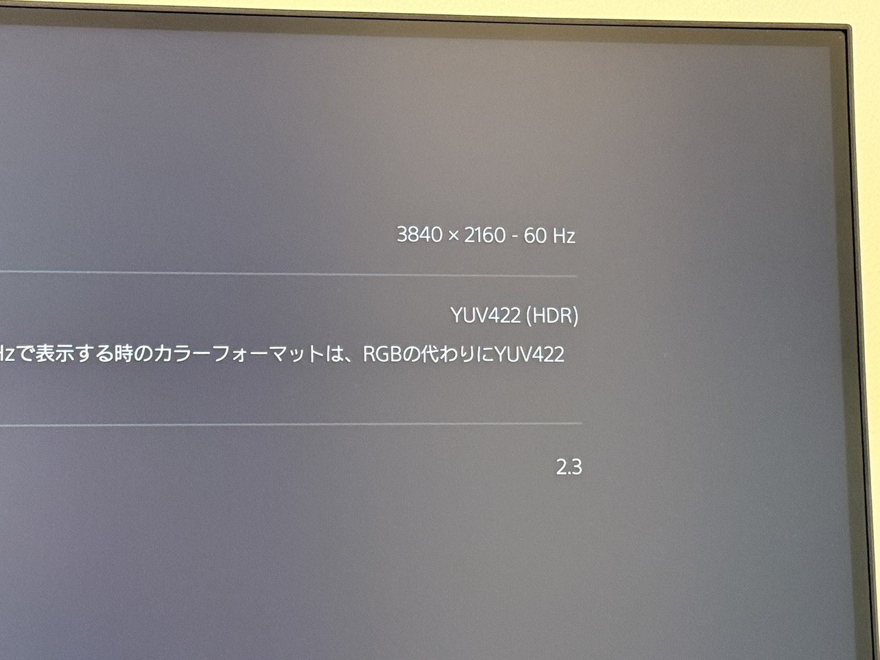 ▼PS5接続時の映像出力情報。解像度は3840×2160となっているが、モニター側ではWQHD解像度での描画となっている。