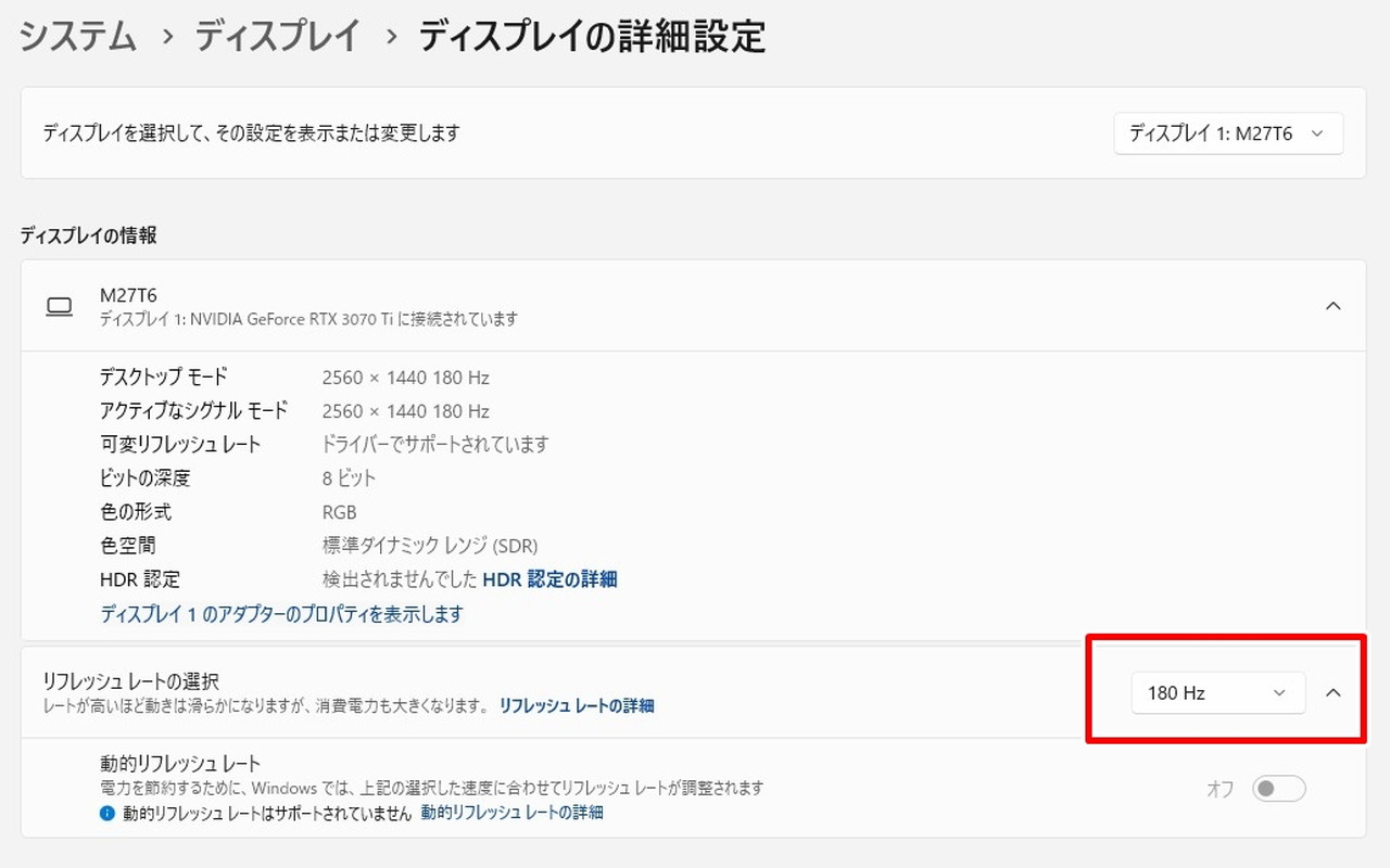 ▼ディスプレイの表示情報。DP 1.4を使用することで、最高180Hzリフレッシュレートに対応。