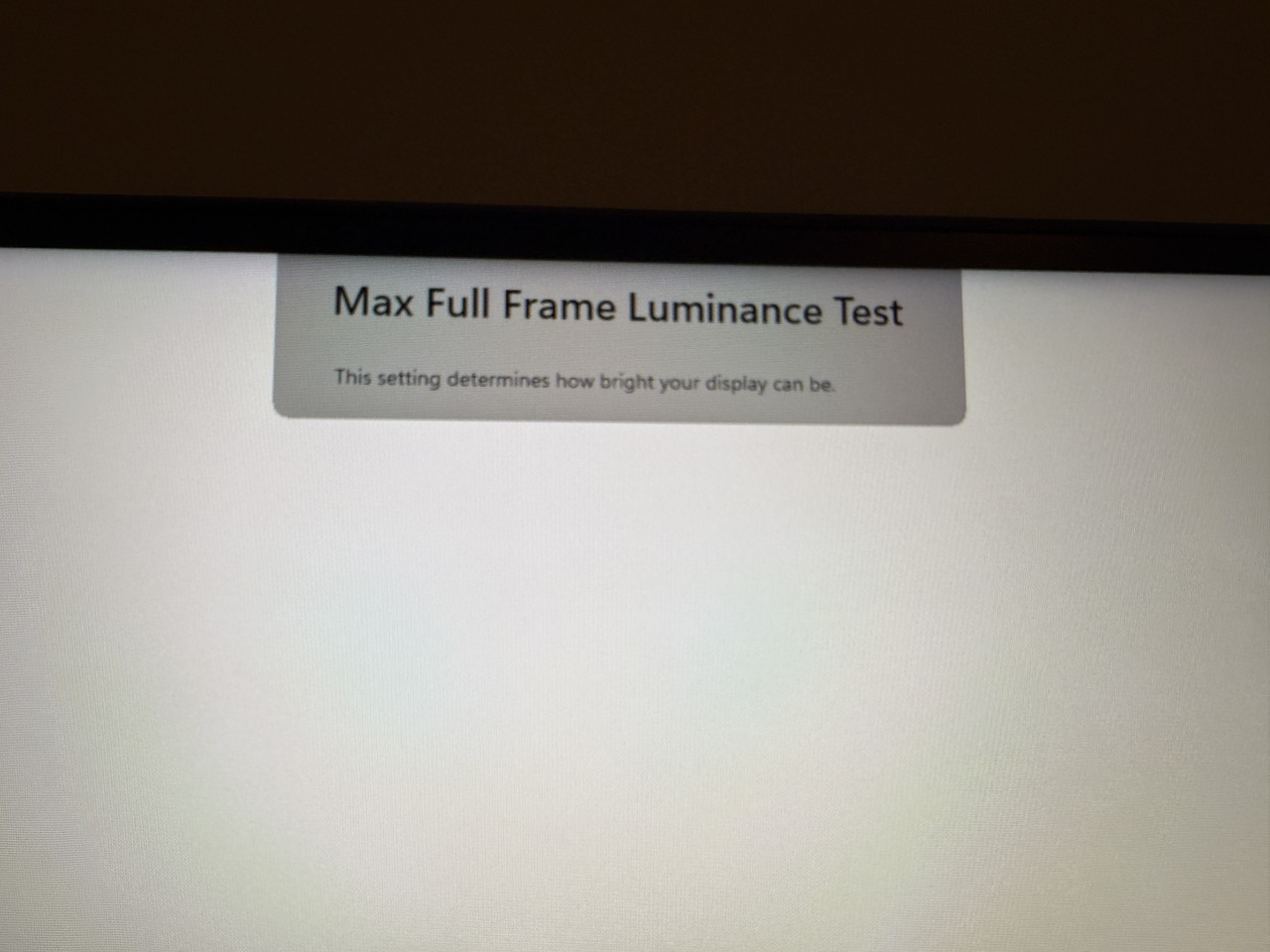▼「Windows HDR Calibration」を使用して、Max Full Frame Luminance test (フルフレーム最大輝度テスト) 時の画面を測定。