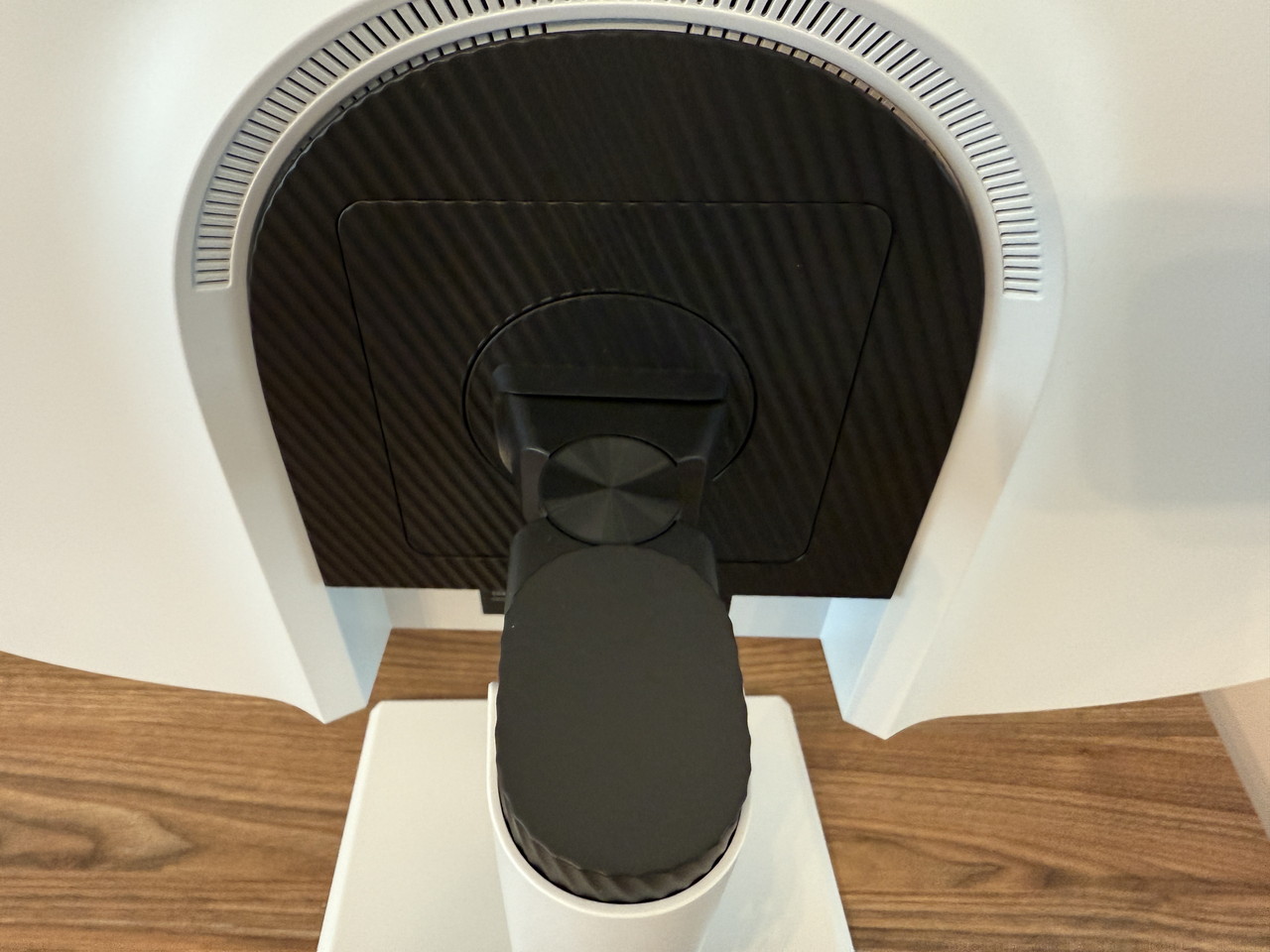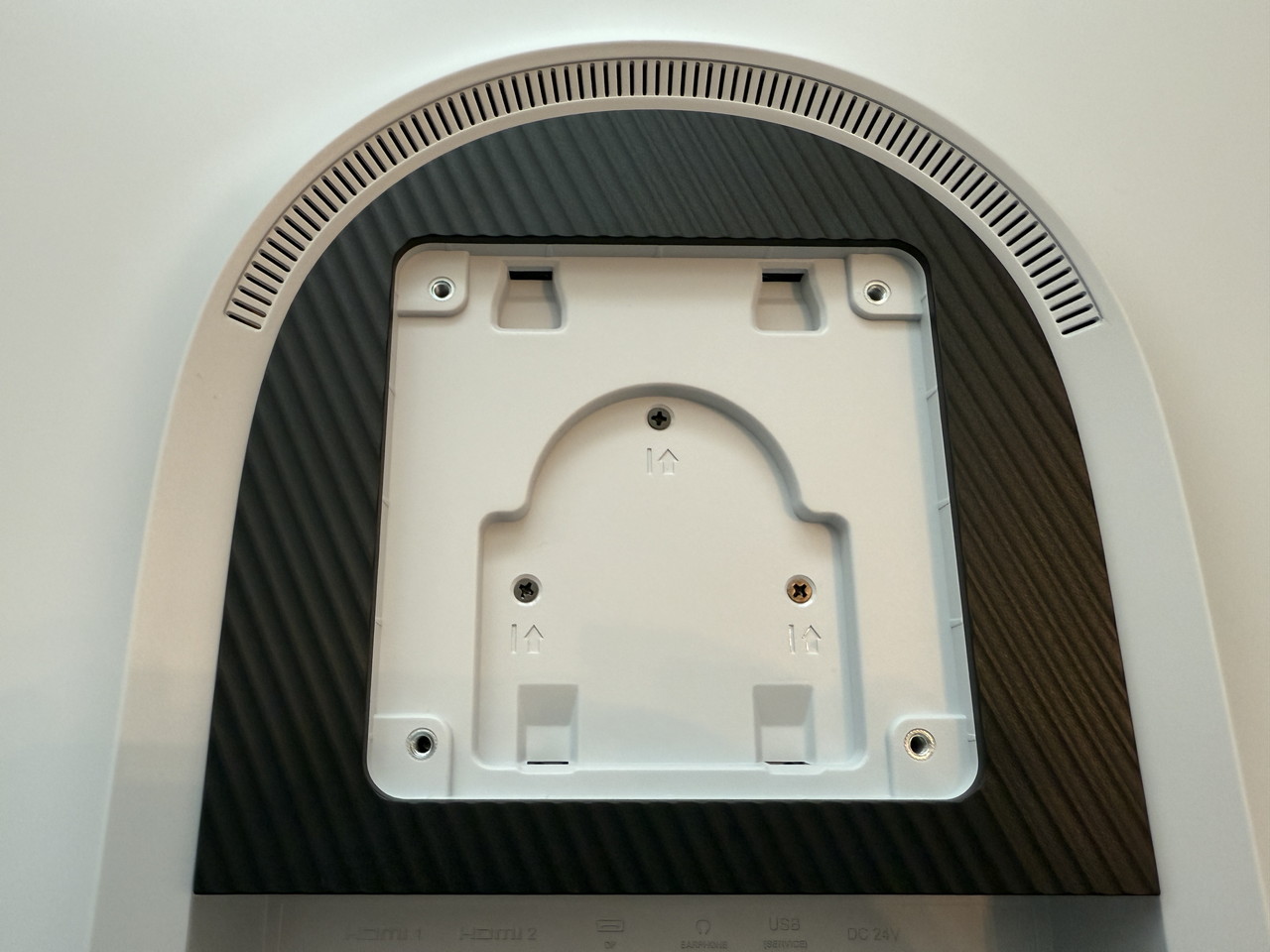 ▼背面中央にはスタンド取り付け用ポートが用意。100mm×100mmサイズの四つ穴も開いており、モニターアーム等を接続することも可能。