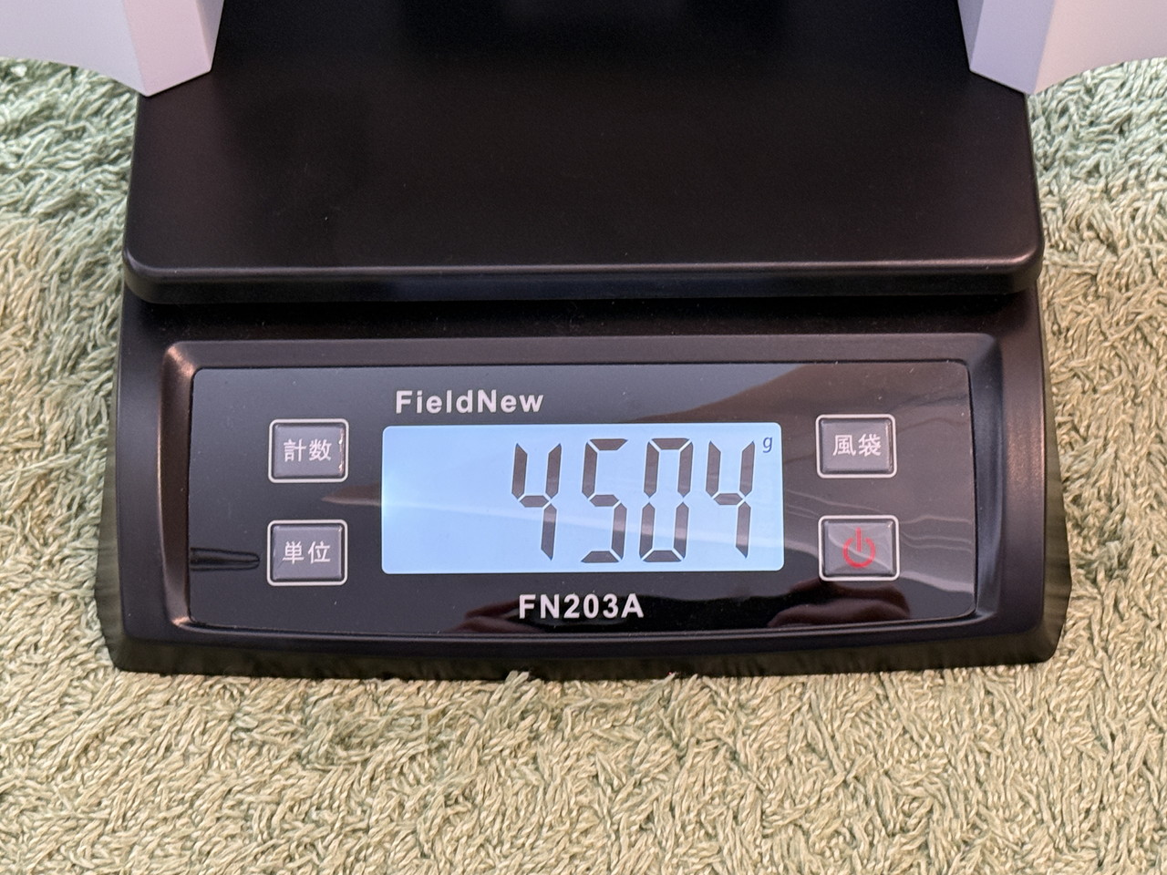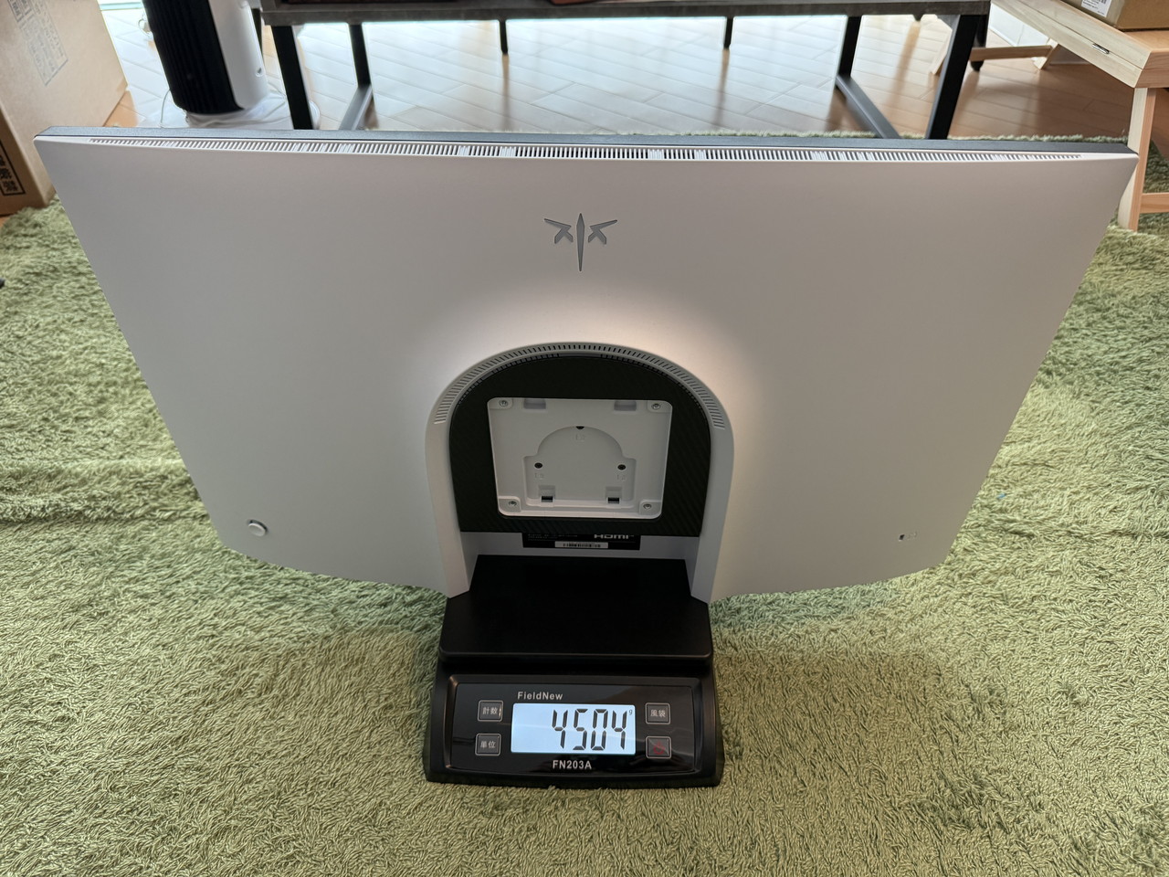スタンド&ベース非装着時のモニター重量は、実測で約4,504g。