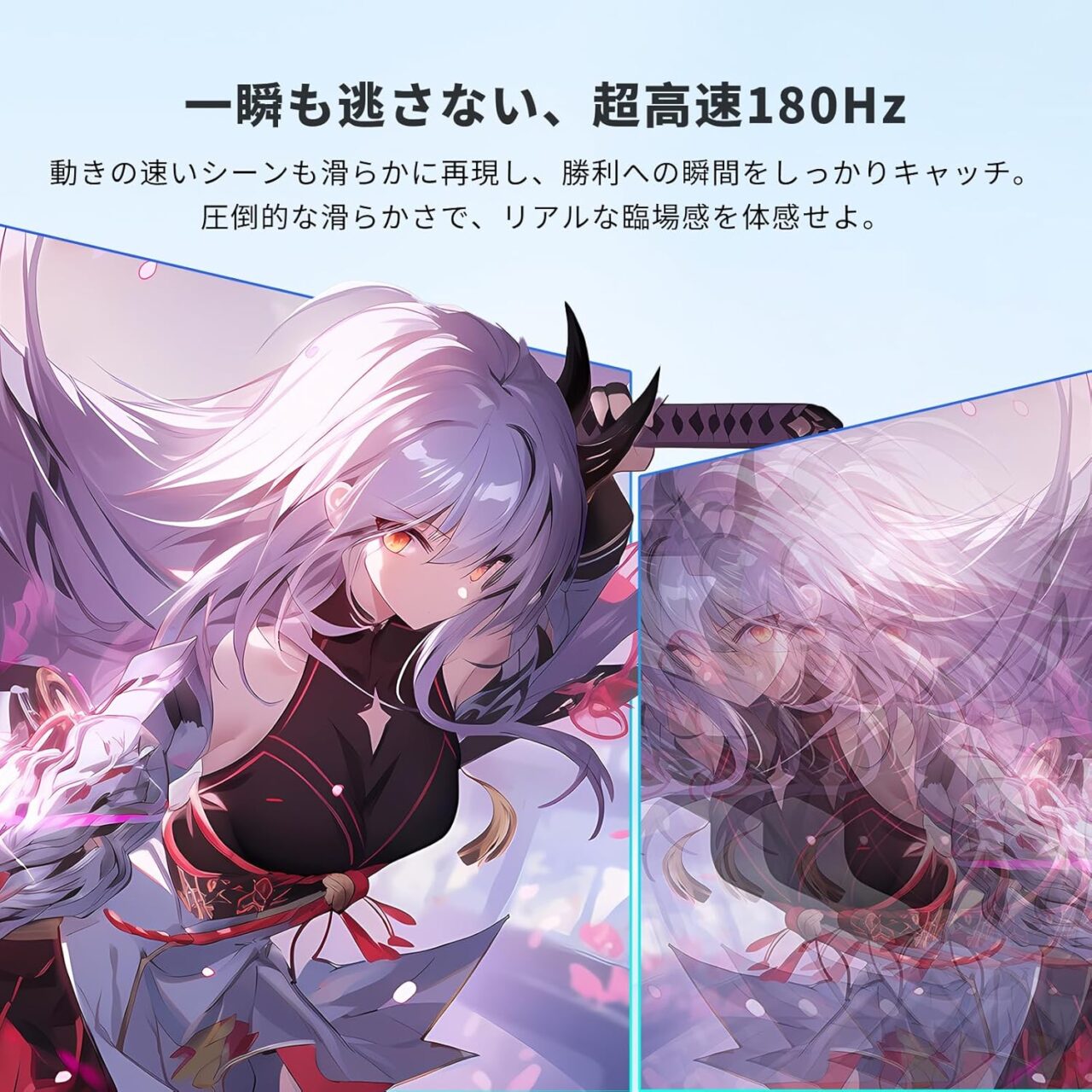 2560×1440(WQHD)解像度、最高180Hzリフレッシュレートの、非常に滑らか&高精細な描画でゲームを楽しめる。