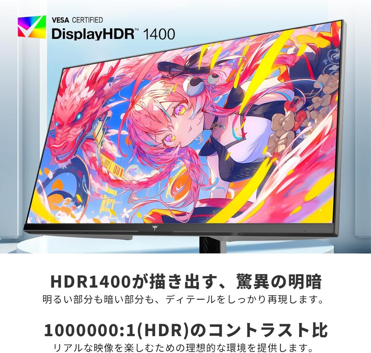 そしてHDR1400をサポート。HDR描画時には1,400nitsもの驚異的なピーク輝度を誇り、暗い部分から明るい部分までを鮮明に描画することができる。上位クラスのディスプレイと言っても過言ではない構成となっている。