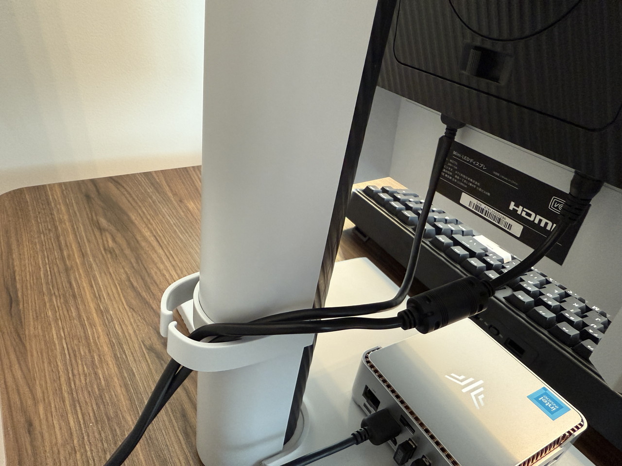▼スタンドにはケーブルホルダーが付いており、モニター背面から伸びるケーブルを纏めることができる。