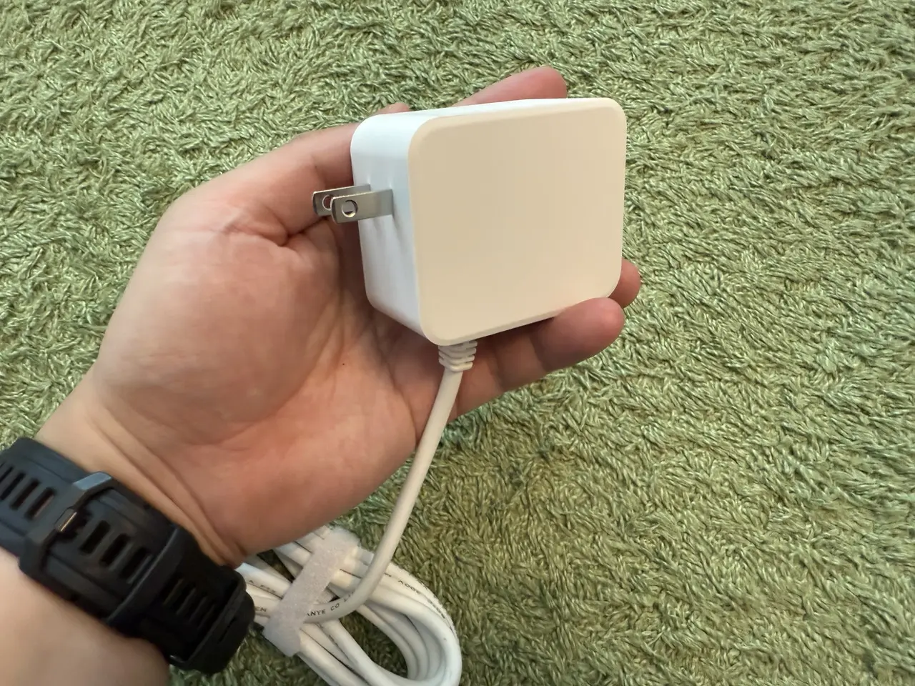 充電用アダプタは65W対応。比較的コンパクトなサイズで、収納時にもスペースを取りません。