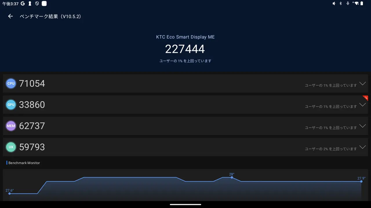 MegPad A27Q7は、SoCに「Snapdragon 662 オクタコアプロセッサー」を、RAMに8GBを搭載。AnTuTuベンチマークテストを実施したところ、227,444点の結果が得られました。