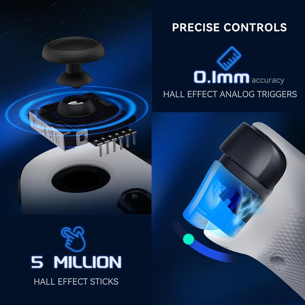 ホール効果スティックを備えており、非接触磁気センサーを使用して位置と動きを測定し、スティックのドリフトを防ぎ、最大500万サイクルの持続が可能となっている。
