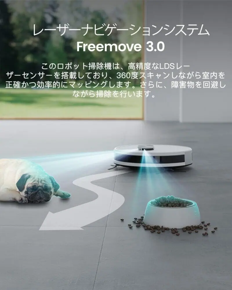 「Freemove 3.0」と呼ばれる独自のレーダーナビゲーションシステムを搭載しており、部屋内を360度スキャンしながら正確かつ効率的なマッピングが可能。障害物を認識し、回避しつつスムーズな掃除を行うことができる。