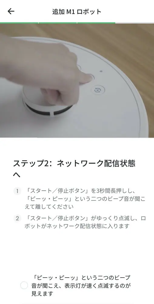 接続完了後、アプリ上の「開始」ボタンをタップすることで最初の掃除(マッピング)が開始される。