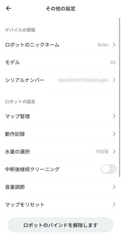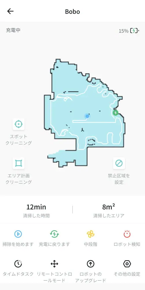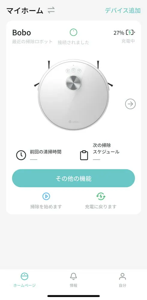 ロボット掃除機のペアリング(接続)が完了すると、アプリのメインメニューが表示される。
