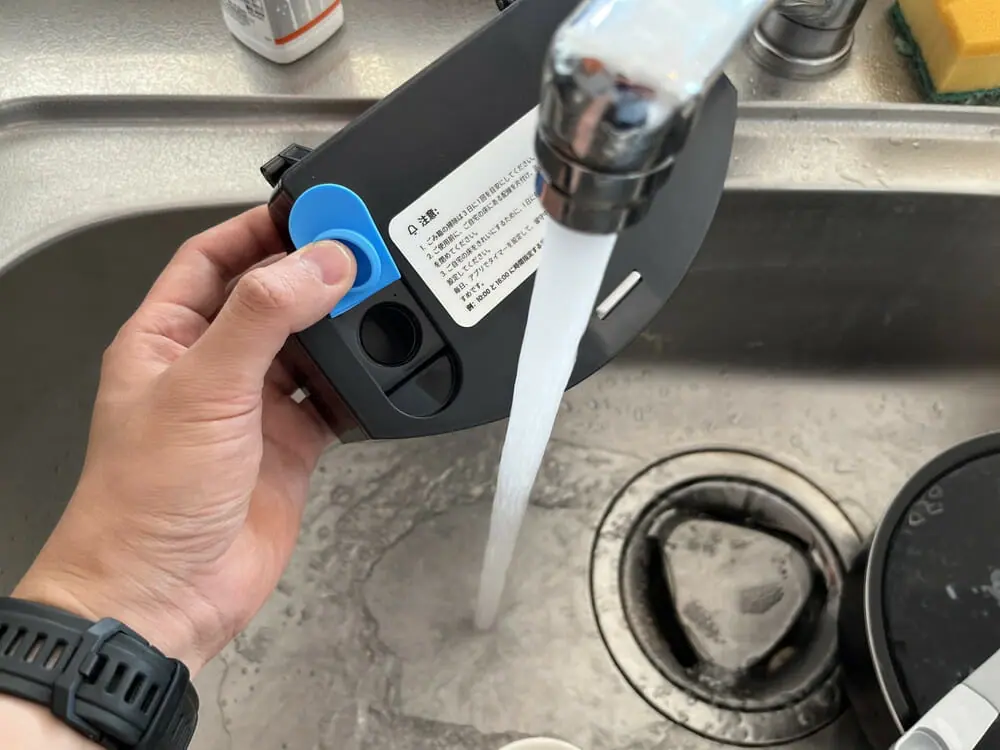 ▼水拭きを行わせる際は、事前にステーションの清水タンクへ洗浄用の水道水を注いでおこう。