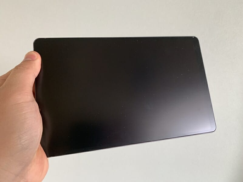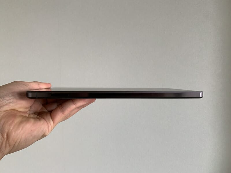 ▼207×128×7.9mmのコンパクトな筐体。本体重量は約375グラムと軽く、長時間持ち続けても疲れづらい。