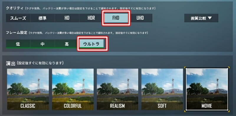 まずグラフィッククオリティに関しては、現時点の最高設定である『FHD』までを選択することが出来た。
