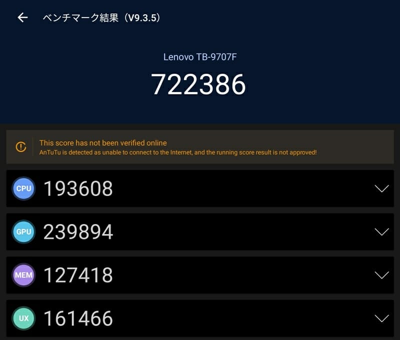 本機について、スマホ・タブレット端末の性能を測ることのできる『AnTuTuベンチマークテスト』を実施してみた。