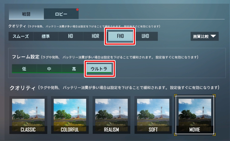 まずグラフィッククオリティに関しては、現時点の最高設定である『FHD』までを選択することが出来た。