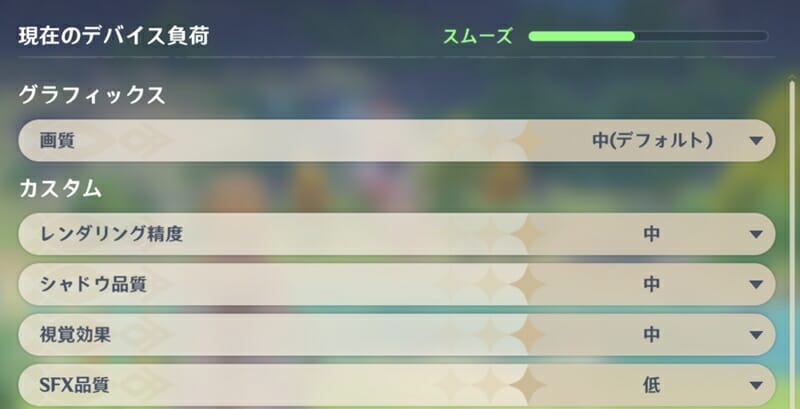 ▼画質設定はデフォルト状態で "中" に設定されており、デバイス負荷は "スムーズ" の状態。