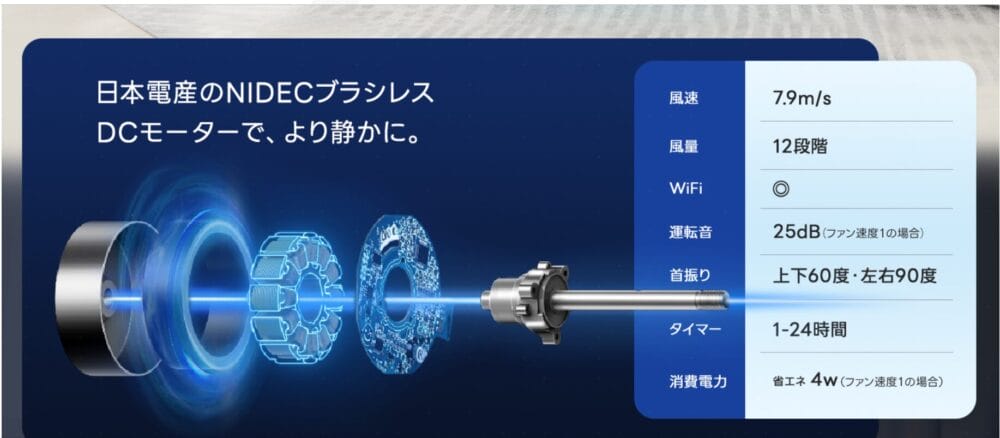 そしてスマートフォンのアプリと連携することで、スマホからの遠隔操作が可能(付属リモコンからの操作も可能)。電源のオン/オフや風量、首振りだけでなく、タイマーやスケジュール設定もアプリから行うことができる。
