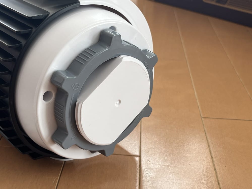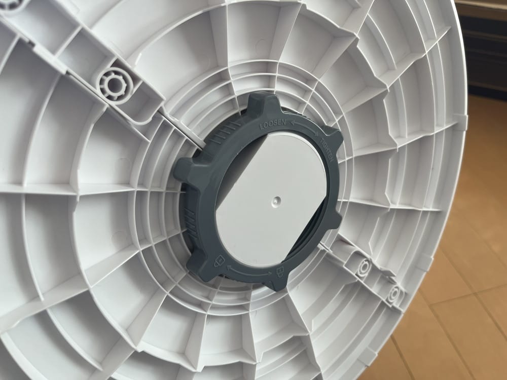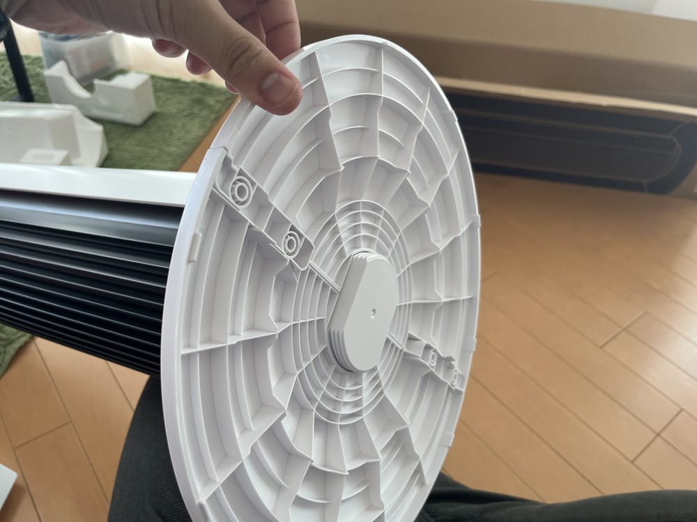 そしてスタンドをタワーファン下部に装着し、その下から固定リングを締めてしっかりと固定する。