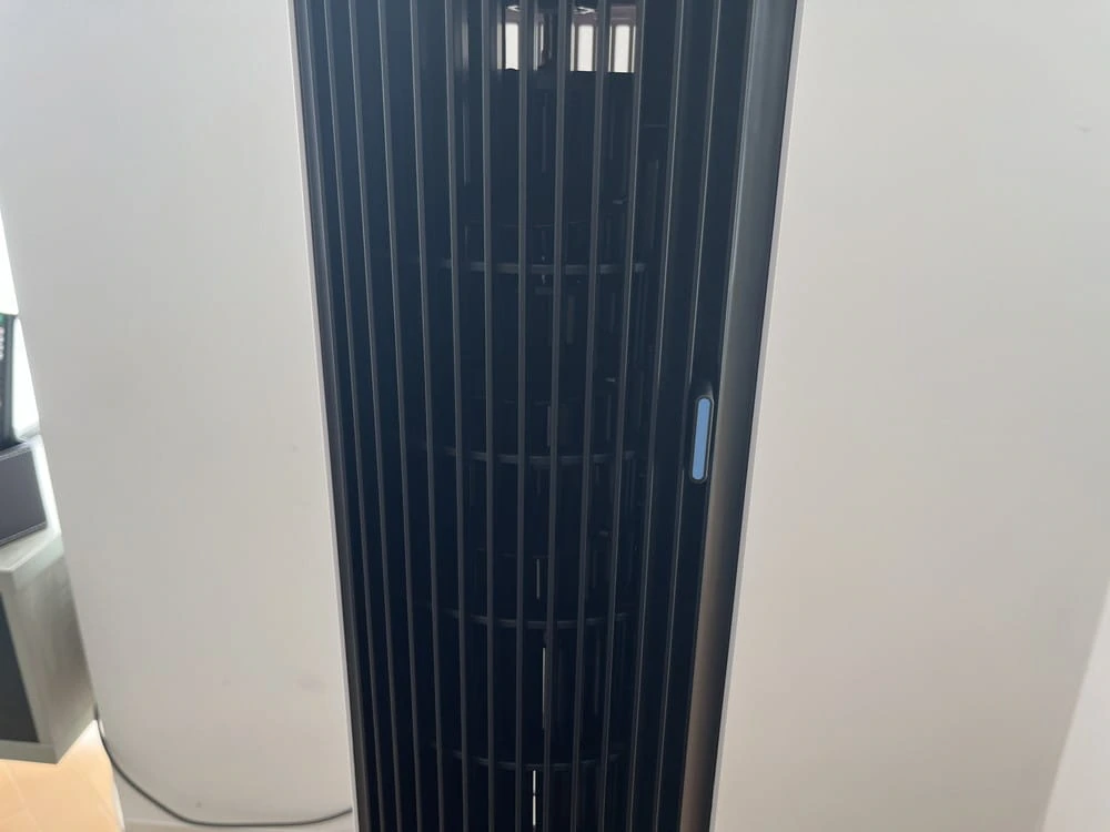 電源アダプタ接続後、上部タッチパネルの電源ボタンをタップするか、リモコンの電源ボタンを押すことで稼働が始まり、風が正面から吹き出てくる。
