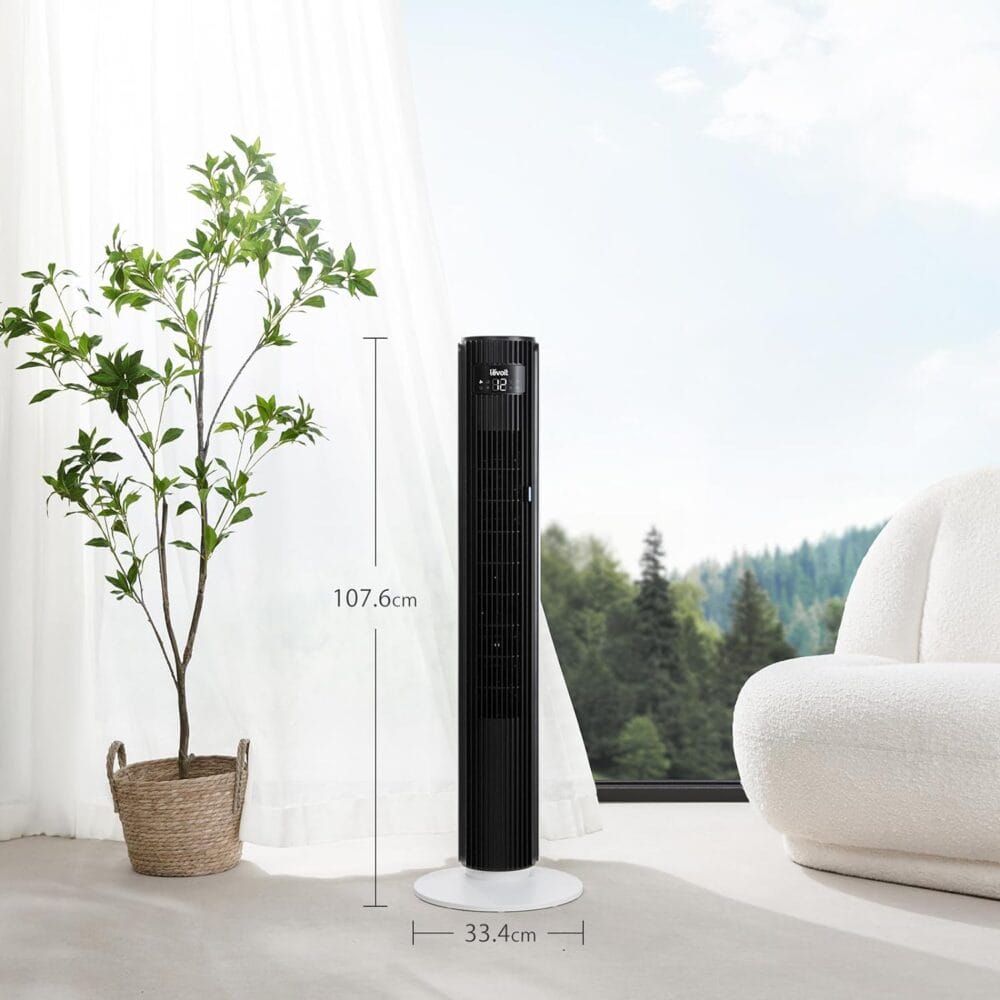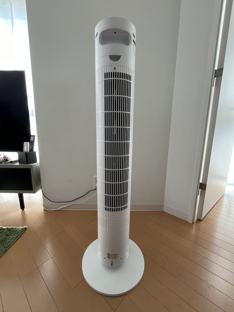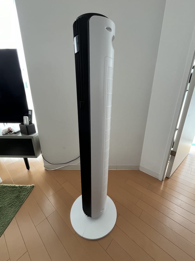 タワーファンは直径33.4cm、高さ107.8cmの円柱形デザインであり、一般的な扇風機と比べても設置面積を最小限に抑えられる点が嬉しい。