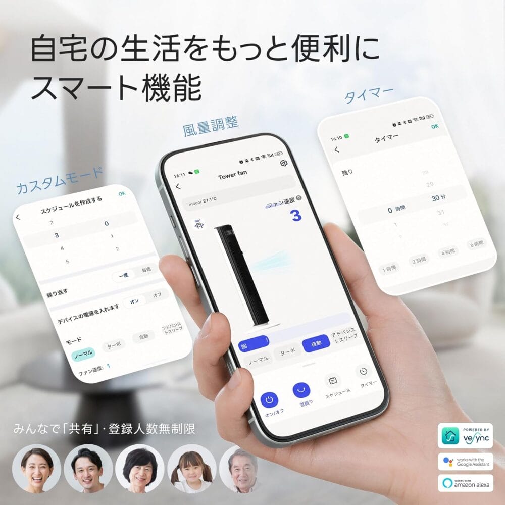 そして何より、タワーファンをアプリ経由でWi-Fiに接続することで、Amazon Alexa(アレクサ)や Google Assistantなどのスマートスピーカーと連携して、声で操作指示を出すことが可能となる。