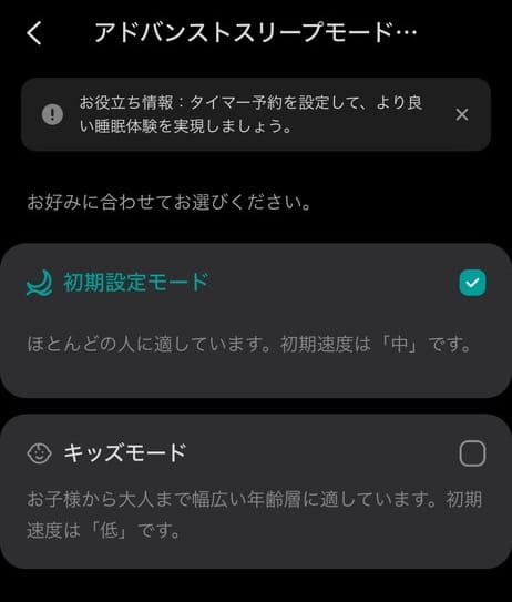 ▼アドバンスドスリープモード時には消音アイコンが表示され、ボタンタップ時に電子音が鳴らないようにできる。また、ディスプレイも消灯し、睡眠に適した状態となる。