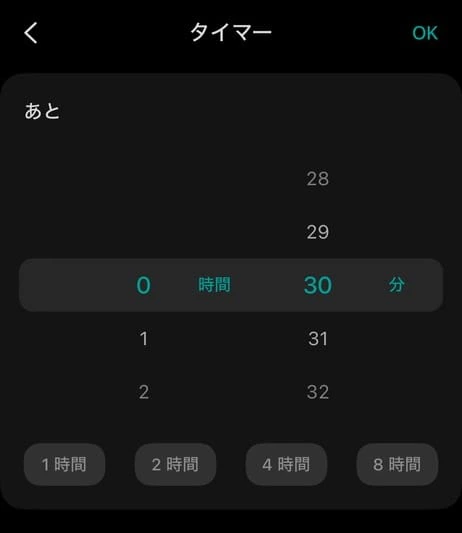 ▼ファン本体上では1時間刻みであったが、アプリ上では1分刻みの詳細なタイマー設定が可能。