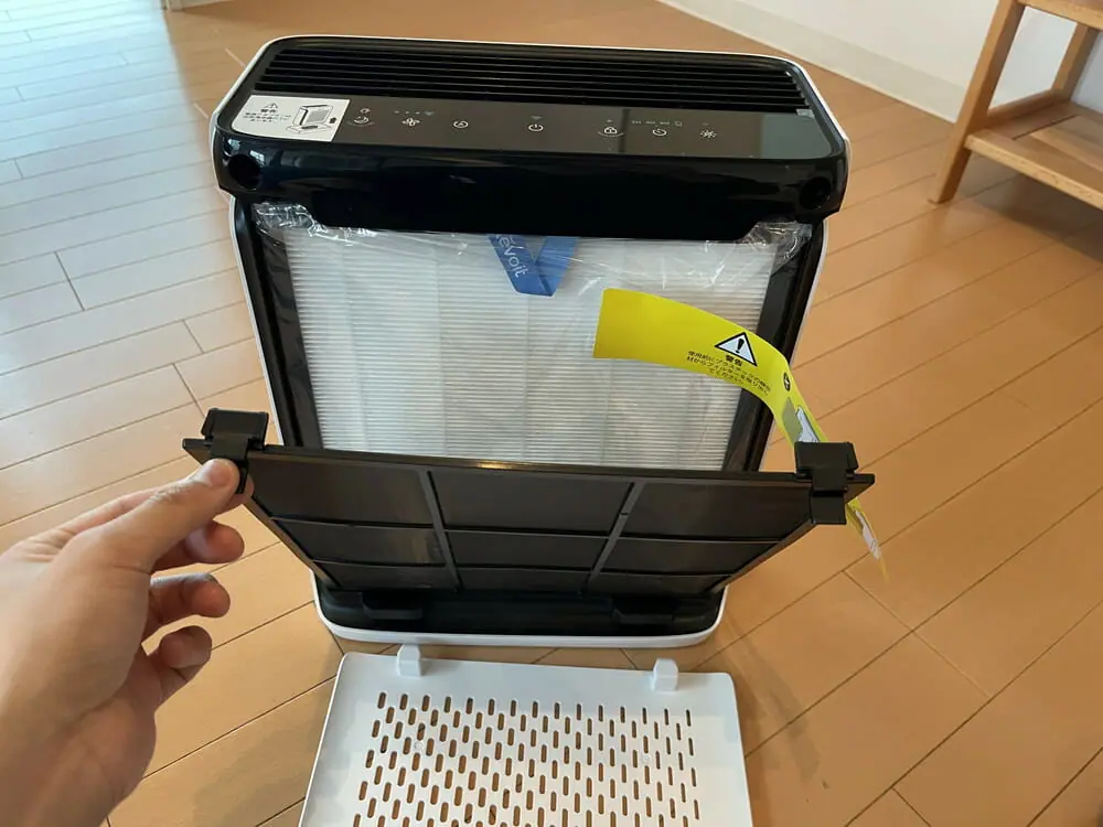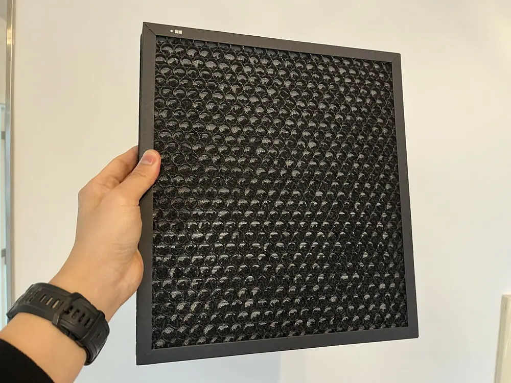 最後に、「活性炭フィルター」が脱臭専用で、タバコの臭いや体臭、ペットの臭い、部屋干し衣類の生乾きの匂い等を速やかに分解する。