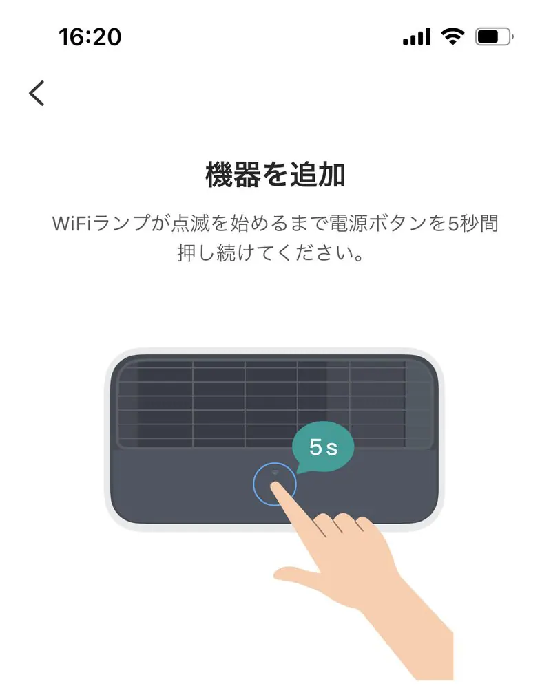 空気清浄機の電源ボタンを5秒以上長押しして、ペアリング待機状態にする。