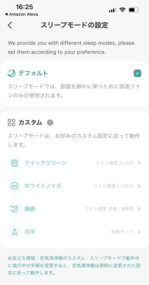 「スリープモード」は、デフォルトでは低速ファンに切り替わるだけだが、アプリではクイッククリーン、ホワイトノイズ低減、睡眠時間設定、昼間の動作設定など、より詳細な調整が可能だ。