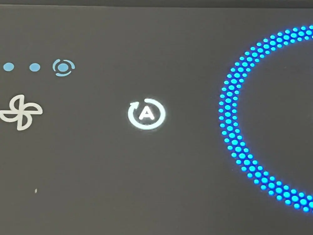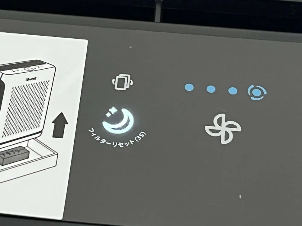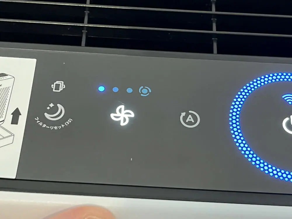 ▼「照明切り替えボタン」。タップすることで、空気清浄機のLED照明をすべて消すことができる。寝るときなどに役立つ。