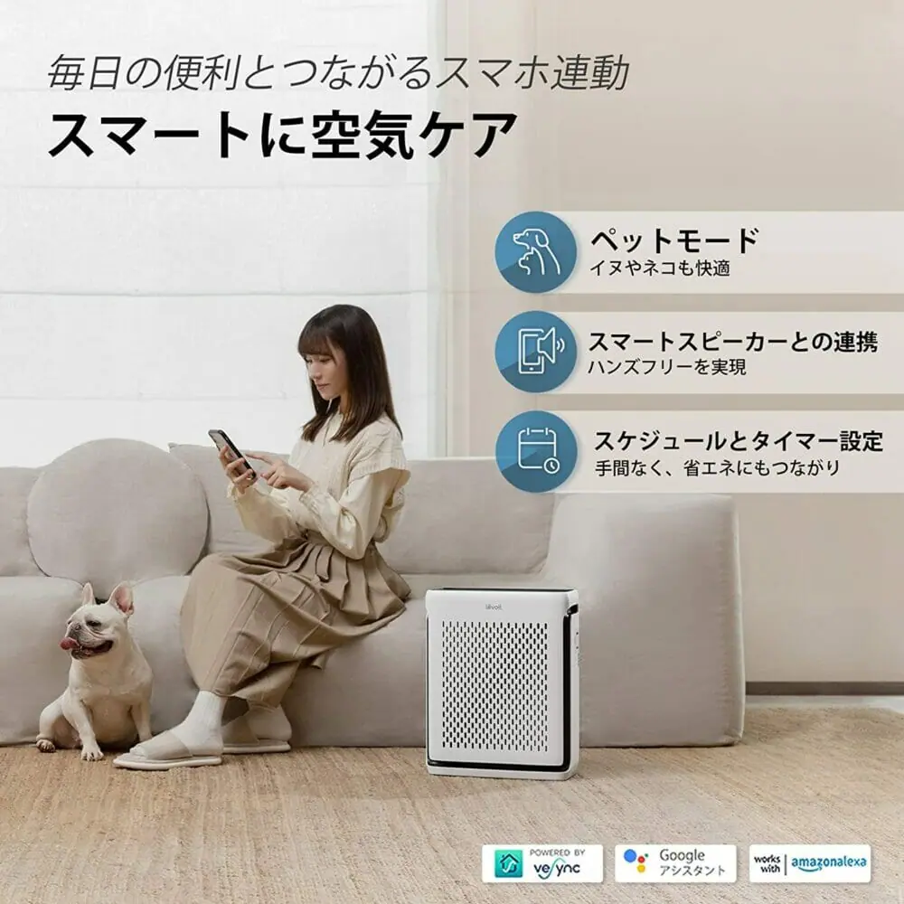 無料の専用アプリVeSyncとスマートスピーカー「Alexa」や「Google Assistant」との連携により、電源のオン・オフ、モードの切り替え、タイマー設定、スケジュール設定などが手間なく簡単に操作できる。