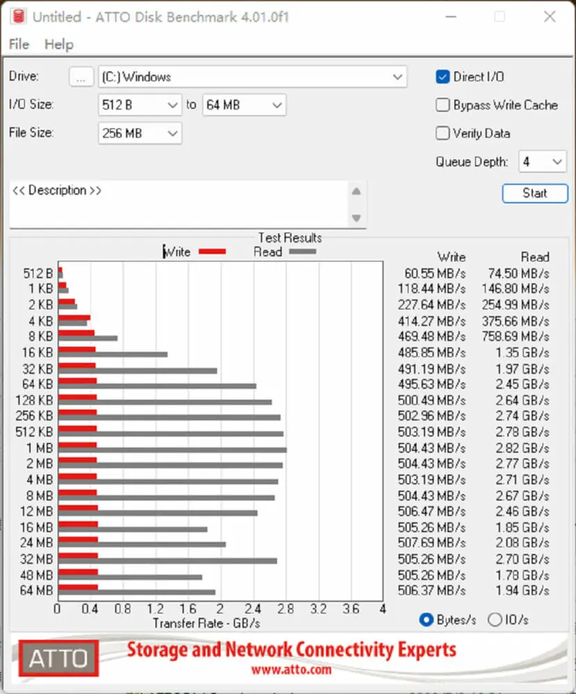 ▼ATTO Diskbenchmarkはシーケンシャルリード・ライトともにやや遅いが、安定した数値を発揮している